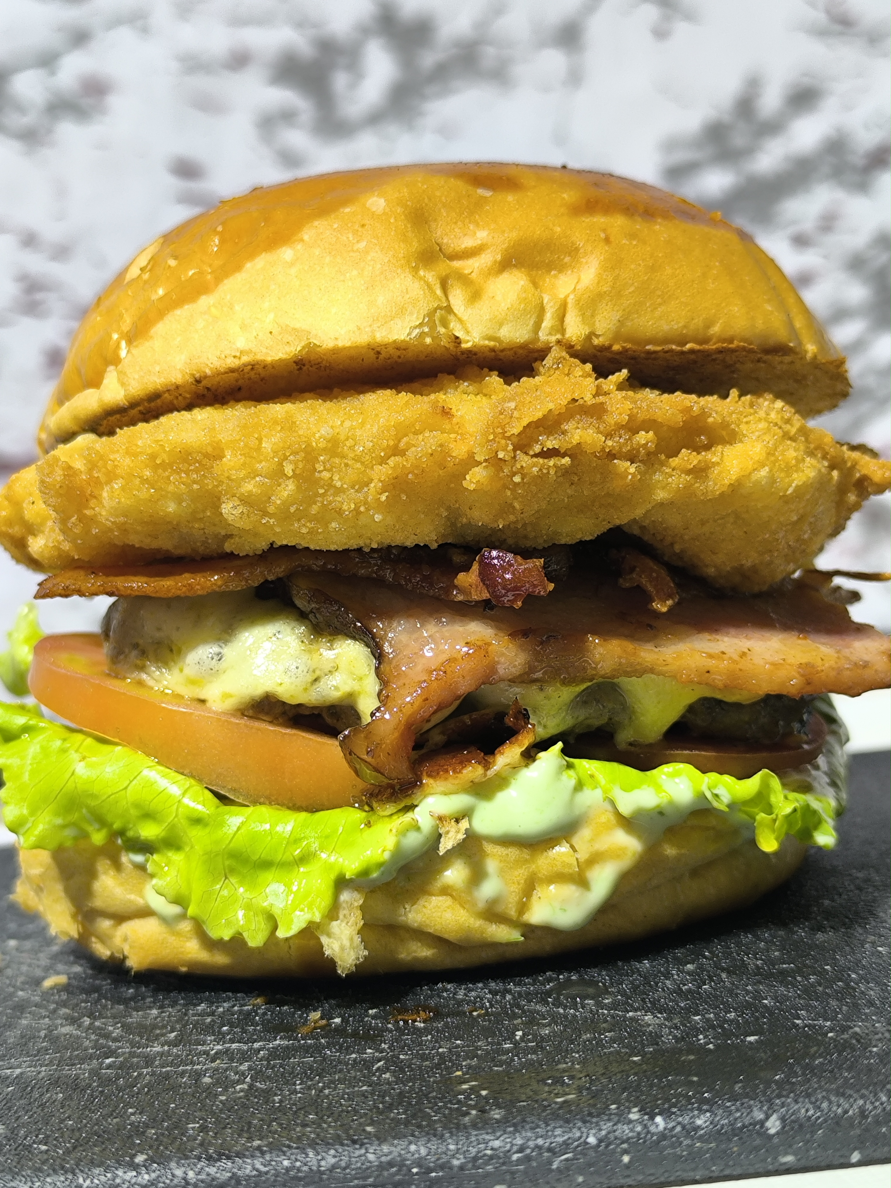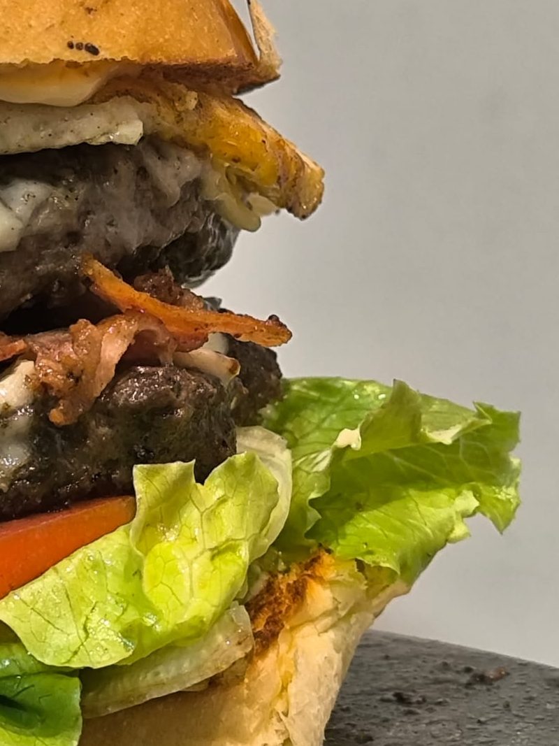 Pão brioche,3 hamburguer 150g, queijo muçarela, bacon, alface, tomate, cebola caramelizada e molho secreto.
